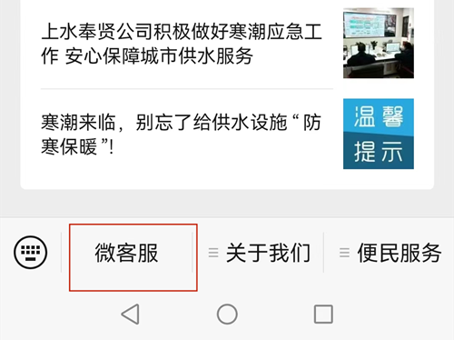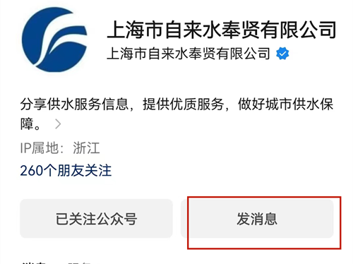2、关注“上海市自来水奉贤有限公司”公众号,点击发消息