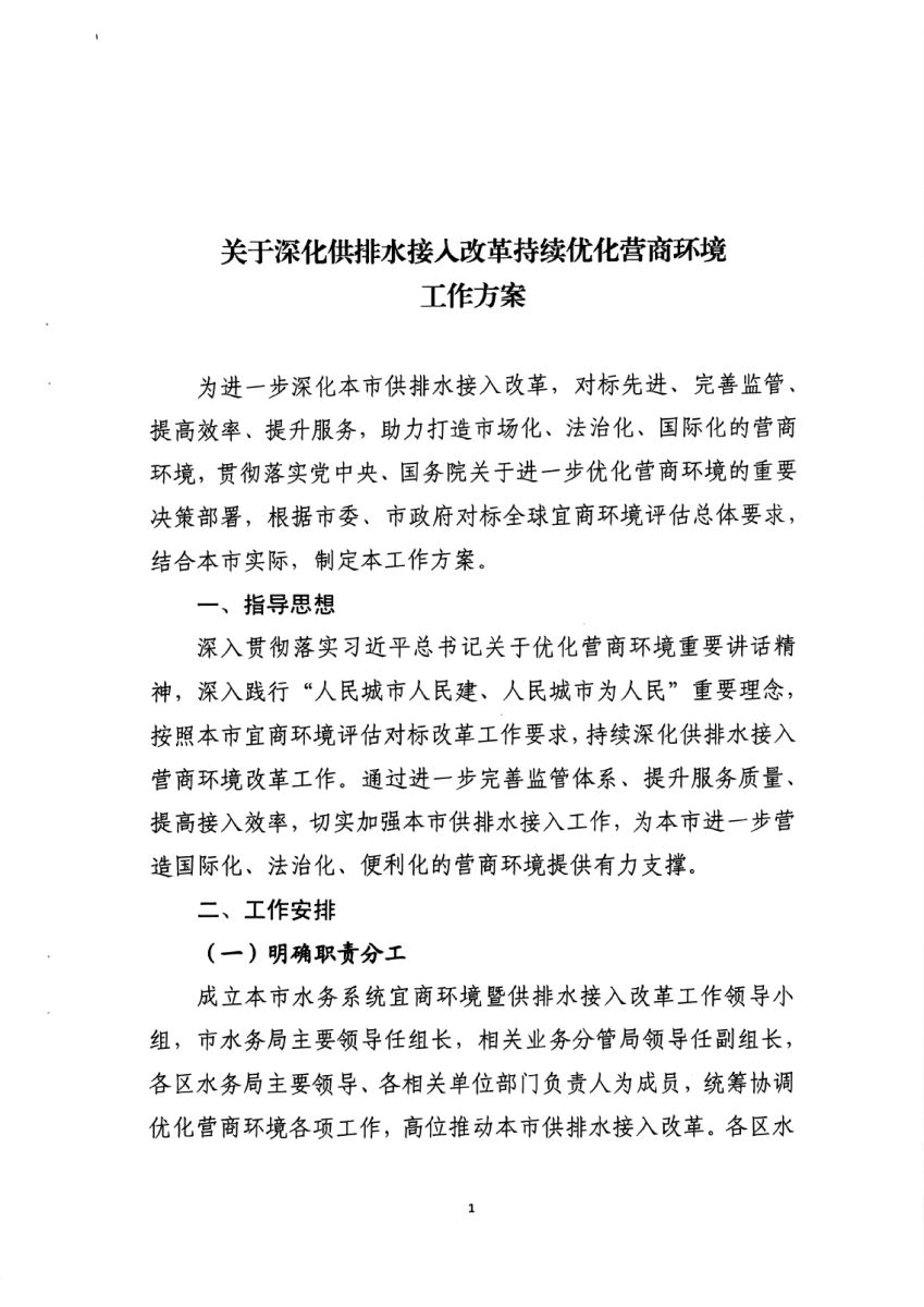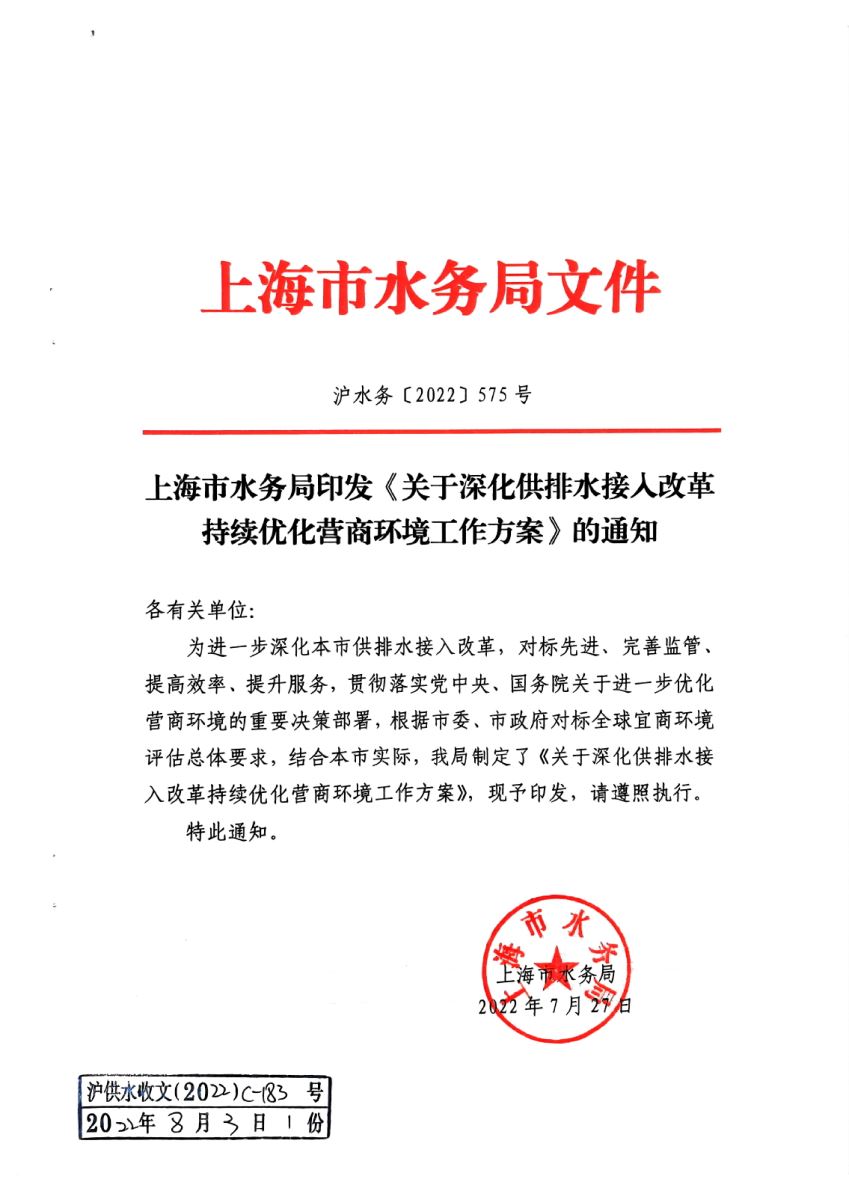上海市水务局印发《关于深化供排水接入改革持续优化营商环境工作方案》的通知