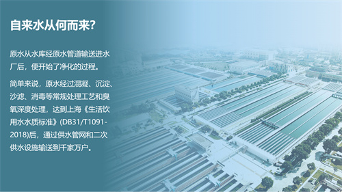 从专业水处理的角度说,我们日常使用的自来水已经非常安全。原水经过混凝、沉淀、沙滤、消毒等常规处理和臭氧深度处理,在达到上海《生活饮用水水质标准》(DB31/T1091-2018)后,通过供水管网和二次供水设施输送到千家万户。