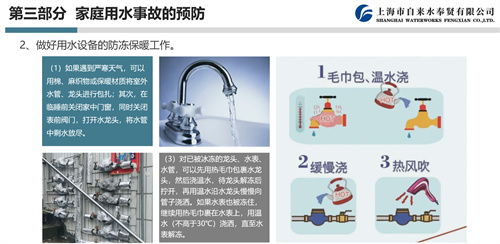 (2)对已被冰冻的龙头、水表、水管,可以采用毛巾包、温水浇、缓慢浇、热风吹的方式进行解冻处理。